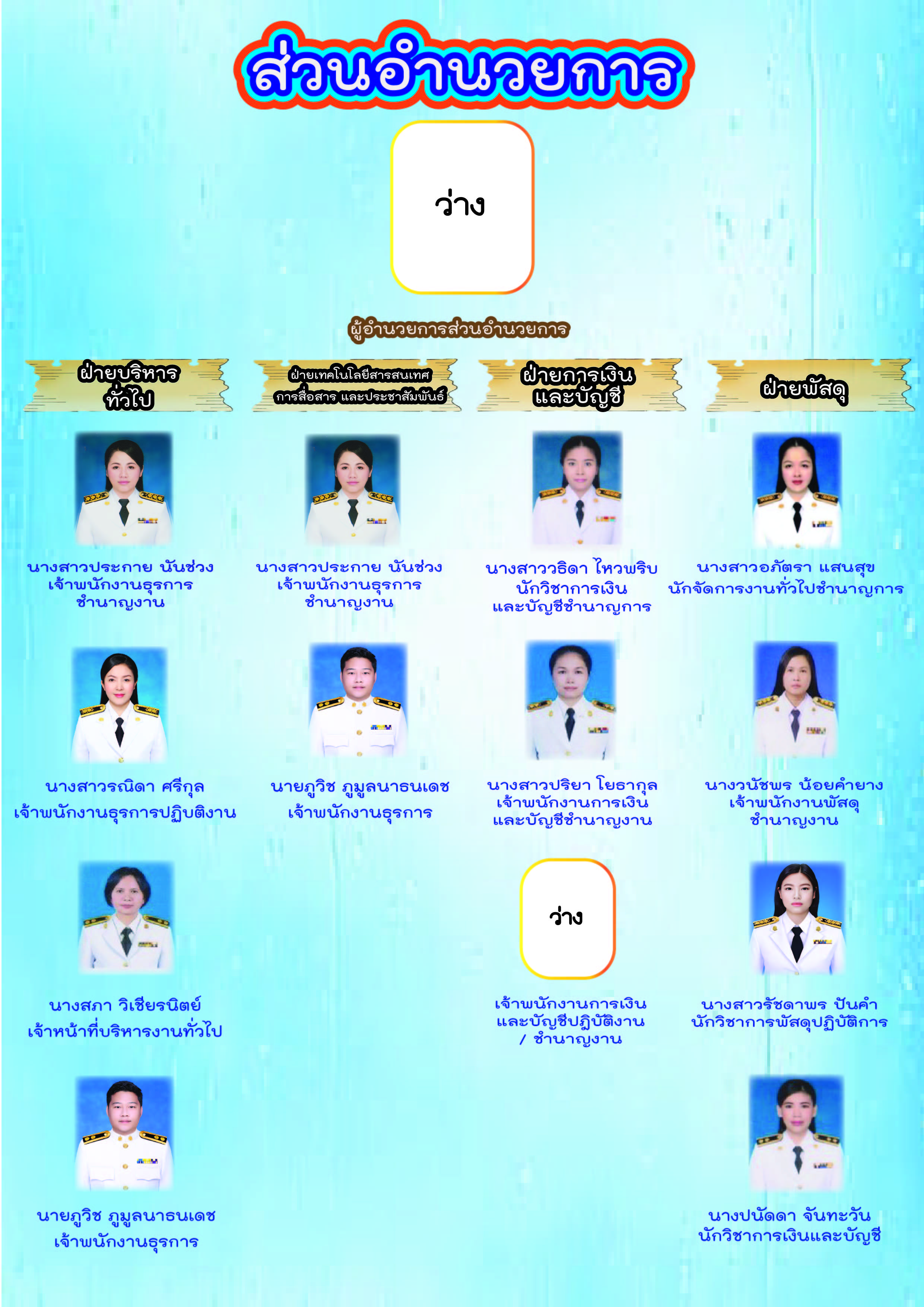 ส่วนอำนวยการ มีหน้าที่รับผิดชอบงานธุรการ งานสารบรรณ งานการเงิน บัญชี พัสดุ และด้านบุคคลของสำนักงาน ประสานงานราชการต่างๆ ที่ไม่อยู่ในความรับผิดชอบโดยตรงของส่วนอื่น ตลอดจนปฏิบัติงานร่วมกับหรือสนับสนุนการปฏิบัติงานของหน่วยงานอื่นที่เกี่ยวข้องหรือที่ได้รับมอบหมาย